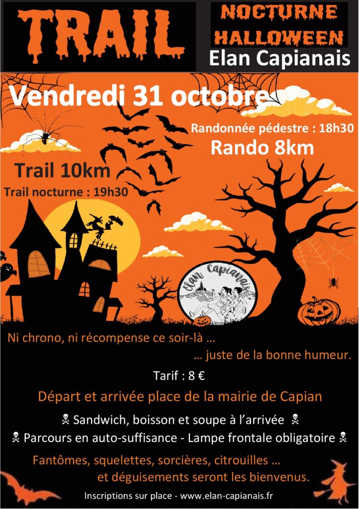 Venez participer au Trail d’Halloween de l’Elan Capianais, 10km de bonne humeur avec déguisement et surprises le long du parcours.